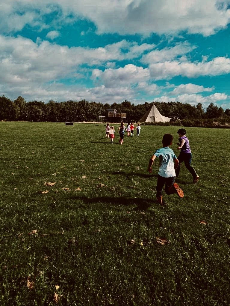 Children can cook campfire toast, enjoy a read-aloud story, and play freely around our site — from mud kitchens and den building to woodland walks, tunnels, fish-feeding at the lake, and relaxing in hammocks. Inside the tipi, there are cosy corners for sharing books, drawing and painting, or exploring with microscopes and binoculars. Hot and cold drinks are available for both children and grown-ups.
